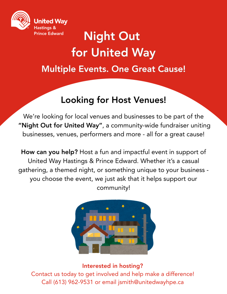 Monday January 12th – a portion of all proceeds will be donated to United Way Hastings & Prince Edward from 5-8PM