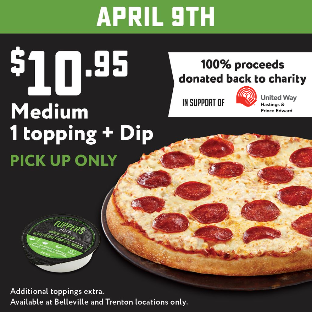 A delicious way to support United Way Hastings & Prince Edward is coming to Topper’s Pizza in Belleville and Trenton on Thursday April 9th!