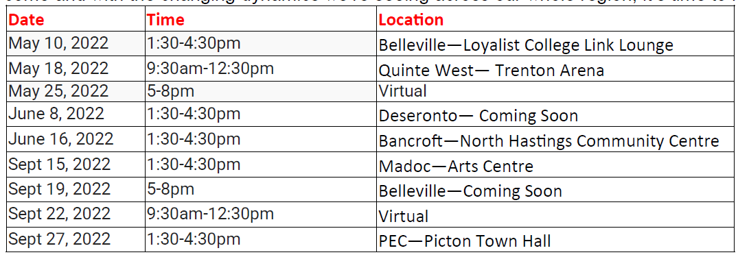 The project is inviting all community members to share their thoughts and ideas about our community’s challenges, strengths, and what they see for our community’s future. A series of open conversations will take place all around Hastings & Prince Edward counties in public spaces throughout May, June, and September.